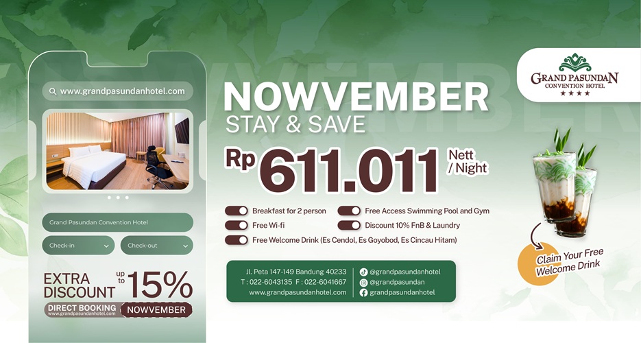 Bisnishotel.id, BANDUNG — Menyambut bulan penuh kebahagiaan, Grand Pasundan Convention Hotel Bandung menghadirkan promo menginap spesial bertajuk “Nowvember Stay & Save”. Hanya dengan tarif Rp611.011 nett per Jamar per malam, para tamu dapat menikmati pengalaman menginap yang nyaman dengan fasilitas lengkap khas hotel bintang empat. Promo ini berlaku selama bulan November 2025 dan menyasar wisatawan maupun pelaku bisnis yang mencari kenyamanan, kepraktisan, dan nilai lebih selama berada di Bandung. Melalui program ini, tamu akan mendapatkan sejumlah keuntungan menarik seperti sarapan untuk dua orang, akses gratis ke kolam renang dan pusat…
