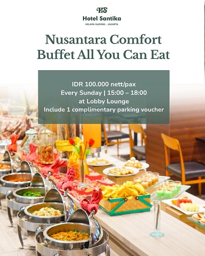 Bisnishotel.id, JAKARTA — Hotel Santika Kelapa Gading menghadirkan promo kuliner spesial bertajuk “Nusantara Comfort Buffet All You Can Eat” yang digelar setiap hari Minggu pukul 11.00–15.00 WIB di Lobby Lounge hotel. Program ini ditawarkan dengan harga khusus Rp100.000 nett per orang, dari sebelumnya Rp120.000. Tak hanya menawarkan harga lebih terjangkau, hotel juga memberikan satu voucher parkir gratis untuk setiap tamu yang melakukan reservasi, sehingga menambah kenyamanan pengunjung yang datang bersama keluarga maupun rombongan. Program buffet ini menyajikan berbagai hidangan khas Nusantara, mulai dari aneka lauk tradisional, sayur-sayuran segar, hingga dessert…
