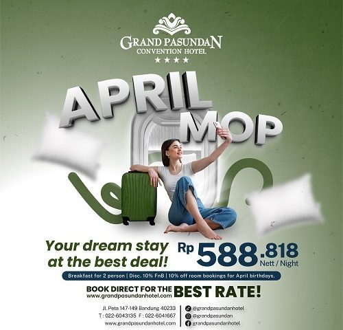 Bisnishotel.id, BANDUNG — Grand Pasundan Convention Hotel meluncurkan promo spesial bertajuk “April Mop” untuk menyambut bulan April 2026. Program ini menawarkan paket menginap dengan harga kompetitif bagi wisatawan maupun pelaku perjalanan bisnis yang berkunjung ke Kota Bandung.