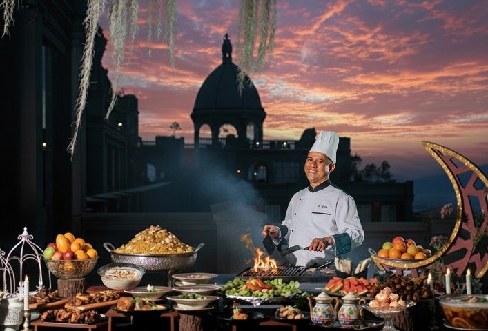 Berlokasi di Alfresco Bistro, suasana berbuka puasa dirancang dengan pencahayaan temaram yang intim, berpadu dengan detail bangunan bersejarah dan sentuhan artistik yang menjadi ciri khas hotel ini. Atmosfer tersebut memperkuat pengalaman bersantap, menjadikan momen berbuka puasa terasa lebih personal dan berkesan.