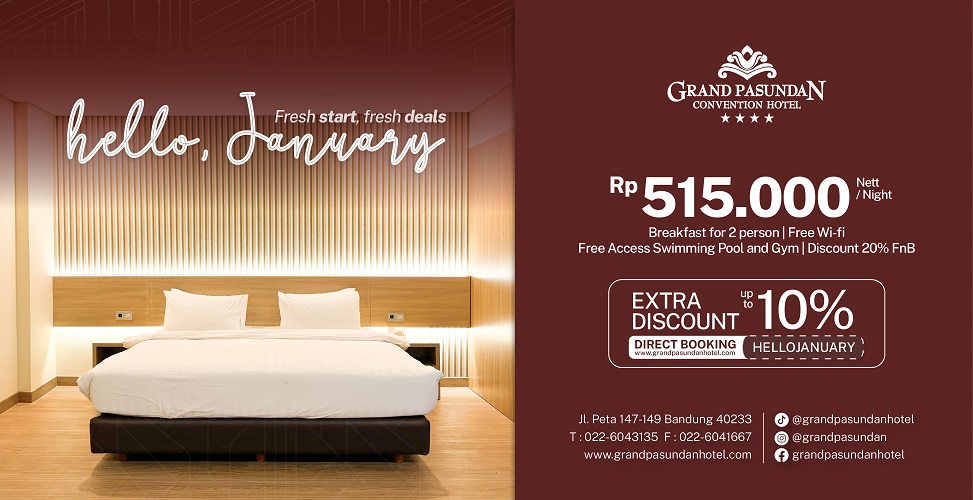 Bisnishotel.id, BANDUNG — Grand Pasundan Convention Hotel Bandung mengawali tahun 2026 dengan menghadirkan program promosi bertajuk “Hello, January – Fresh Start, Fresh Deals”. Promo ini ditujukan untuk memberikan pilihan menginap dengan harga kompetitif sekaligus pengalaman yang nyaman bagi tamu yang ingin memulai tahun baru dengan suasana berbeda. Melalui promo tersebut, Grand Pasundan Convention Hotel menawarkan paket menginap dengan harga Rp515.000 nett per malam. Paket ini sudah termasuk sarapan untuk dua orang, akses Wi-Fi gratis, serta fasilitas kolam renang dan pusat kebugaran tanpa biaya tambahan. Manajemen hotel menilai awal tahun sebagai…