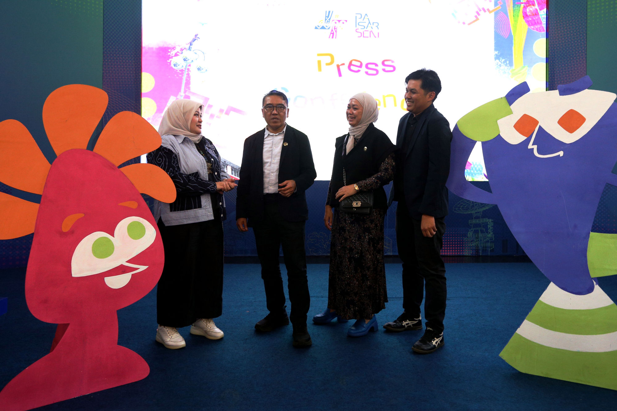 Wakil Rektor Institut Teknologi Bandung (ITB) Rikrik Kusmara (kedua kiri) bersama Direktur Komunikasi dan Hubungan Masyarakat ITB N. Nurlaela Arief (dari kiri), Ketua Umum Pasar Seni ITB Zusfa Roihan, dan Dekan Fakultas Seni Rupa dan Desain (FSRD) ITB Kahfiati Kahdar menyampaikan paparan saat konferensi pers menjelang pelaksanaan Pasar Seni ITB 2025 di Aula Barat Kampus ITB, Bandung, Jawa Barat, Rabu (1/10/2025).  Ketua Umum Pasar Seni Institut Teknologi Bandung (ITB) Zusfa Roihan (kedua kanan) bersama Dekan Fakultas Seni Rupa dan Desain (FSRD) ITB Kahfiati Kahdar (dari kanan), Wakil Rektor ITB Rikrik Kusmara, dan Direktur Komunikasi dan Hubungan Masyarakat Institut Teknologi Bandung (ITB) N.…